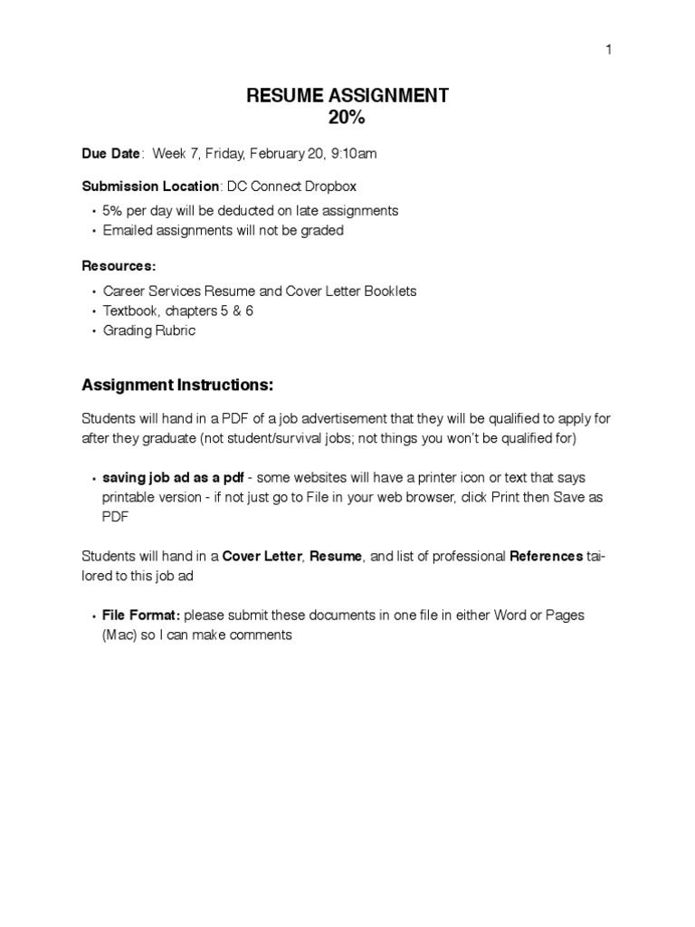 The key to writing an effective cover letter and resume for the business world is to play up your strengths and experience. This is a course assignment and you are not actually applying for a job at this point. The purpose of a resume is to obtain an interview. Using an actual job listing from a company in your area of interest, you will create a jobapplication letter and a resume. Cover letter will be 1 page in length. Cover letter assignment help cover letters can be as essential as your resume or cv itself while applying for occupations, albeit a great many people tragically invest minimal measure of energy in them. Use the template provided and apply the course concepts covered for targeted resumes and cover letters. Ideally, the content of the cover letter should address why you would be a good fit for the organization to which you are applying. Overview in this assignment you will write a résumé and cover letter for a specific job posting. Create a professional resume in just 15 minutes, easy Prepare a draft of your resume and cover letter and upload it to the relevant assignment folder by 3:00pm august 28, 2018. The instructions below is also downloadable: The cover letter should be at most 1 page long.